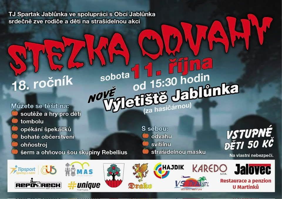 Obec Jablůnka pořádá pro děti a rodiče strašidelnou akci Stezka odvahy, která se bude konat v sobotu 11. října 2025. Více informací v přiloženém souboru...
